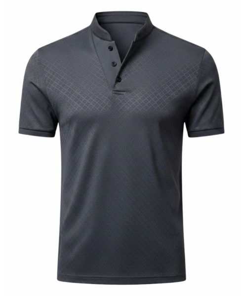 This polo features a geometric, interlocking pattern and a tailored band collar, offering sharp structure without sacrificing comfort. The deep charcoal hue captures the low light of a late-hour rendezvous, ensuring you maintain an air of reserved, quiet authority wherever you go.
