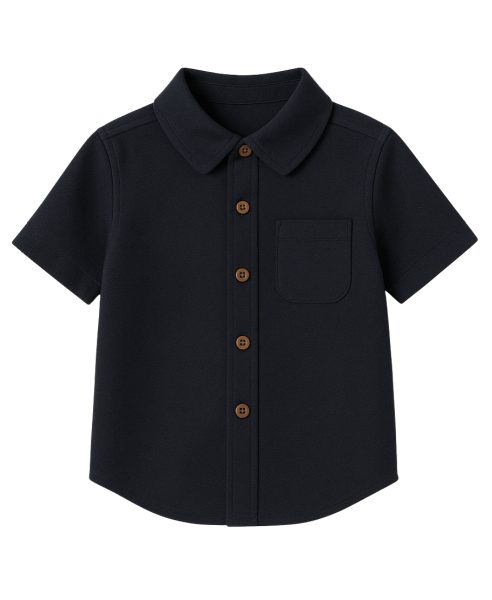 A navy cotton shirt with short sleeves, crafted for comfort and summer ease. Wooden buttons and a chest pocket add a refined, natural touch.
