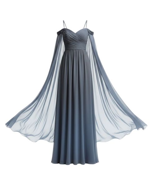 This ethereal gown in dusk blue chiffon features a delicate sweetheart neckline and an elegantly ruched bodice. Its most distinctive feature is the cascading, off-shoulder sleeves that flow gracefully, creating a sense of movement and drama. A floor-length skirt completes this design, ideal for an entrance that is both subtle and unforgettable.