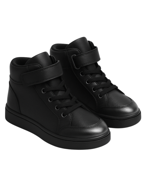 A statement in simplicity. Crafted from supple black leather with subtle silver detailing, these high-top trainers deliver comfort and class in every step. Designed for the young gentleman who knows style has no age.