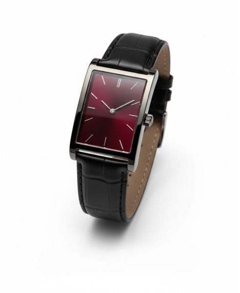 This timepiece features a rectangular face with a deep crimson dial, subtly textured to catch the light. The watch is encased in brushed gunmetal, complemented by a sleek, unadorned leather strap. Its minimalist design speaks of quiet confidence and understated allure.