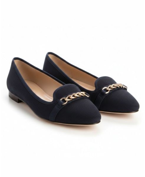 Step into Parisian chic with these refined loafers. Crafted in a deep Dark Navy fabric, they feature a classic silhouette and subtle, comfortable heel. The design is elevated by a polished gold-toned chain detail across the vamp, offering a luxurious contrast to the ribbon trim.