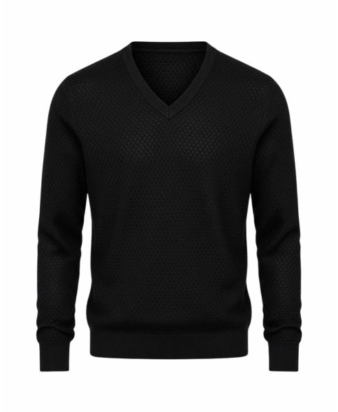 A flawless black V-neck defined by a crisp, uniform honeycomb pattern. This fine texture creates a matte finish, offering a clean, sharp look. Its elegant neckline is ideal for layering over tailored shirting, proving that modern refinement is always found in precision and impeccable fit.