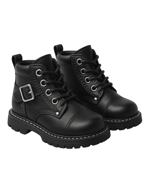 Low light, cold edge. Junior Drift Boots are cut from matte black leather with a soft grain that holds its form without stiffness. A brushed silver eyelet line runs clean up the ankle, catching just enough light to hint at motion. The laces are flat-woven, heavy enough to feel deliberate, while the stitching stays tight and understated.