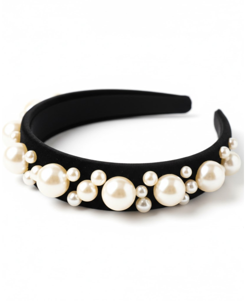 Sophisticated and chic. This comfortable velvet headband features a striking array of luminous pearls, offering a touch of timeless grace for any special occasion.