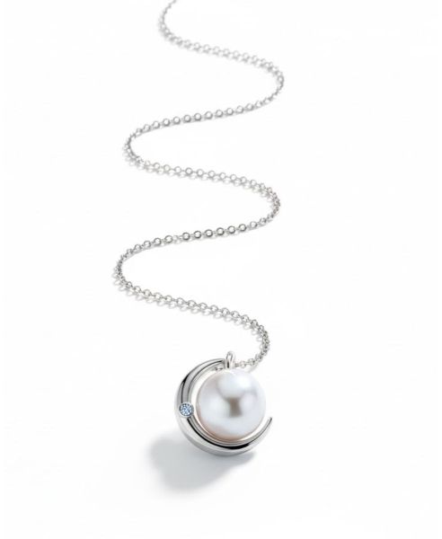 This delicate silver chain cradles a lustrous freshwater pearl, subtly set within a crescent moon motif. A single, tiny sapphire gleams from the silver, adding a whisper of mystery to its celestial design. It’s an understated piece, perfect for adding a touch of quiet elegance.