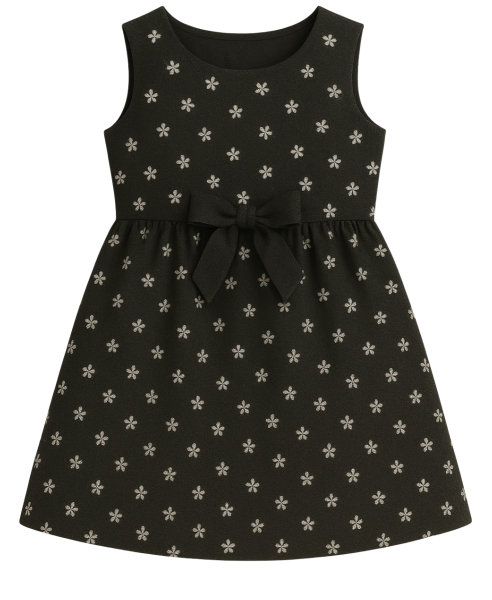 The Midnight Blossom Dress brings a touch of twilight charm to any young dreamer’s wardrobe. Soft and elegant, it blooms with silver flower motifs across a deep noir fabric, finished with a sweet bow at the waist. Designed for comfort, movement, and timeless poise.