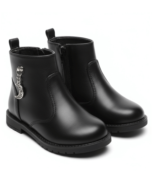 These sweet black ankle boots are both sturdy and stylish, featuring a subtle decorative charm hanging from the side zipper. They offer a fashionable edge while ensuring comfort and durability for little explorers.