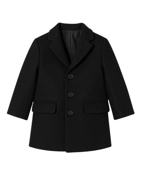 A tailored noir coat with soft lining and refined buttons, designed for warmth and timeless style.