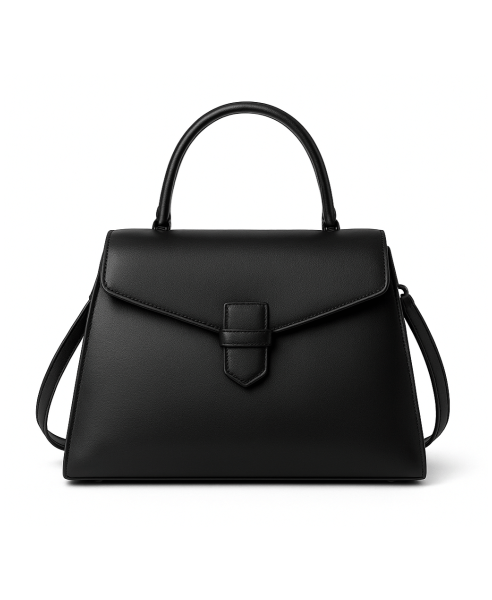 Noir Vérité is a study in quiet elegance. Made from smooth black leather with a subtle matte finish, it combines structure and softness in perfect balance. The clean silhouette is complemented by a curved top handle and a sleek front flap that closes with a refined metal clasp.
