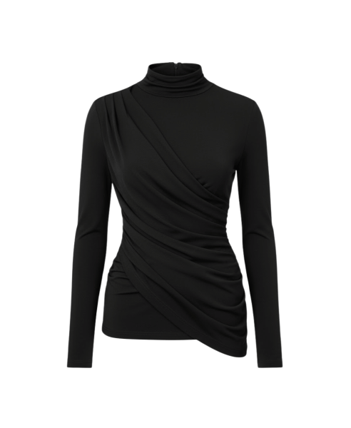 Crafted from a premium, rich black knit, this top features a striking asymmetrical neckline that gently drapes across the collarbone. The fabric's weighted feel ensures an elegant, fluid movement, while the precise, tailored cut offers a flattering silhouette.