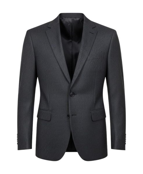 The refined dark grey is defined by a textural micro-pattern that creates depth without demanding attention. Cut with a sharp, single-breasted closure and classic notched lapels, this blazer is the foundation of an elegant strategy, offering versatility and quiet precision.