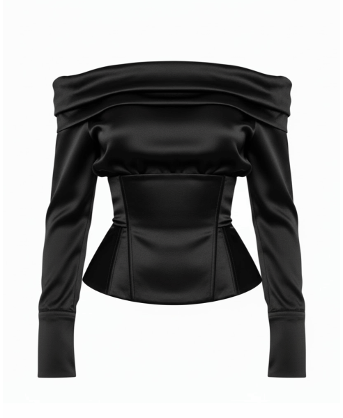 Crafted from luminous 100% black silk, this essential piece features a captivating off-the-shoulder neckline and a tailored, enhanced waist panel. The structured bodice cinches the figure for a flawless silhouette.