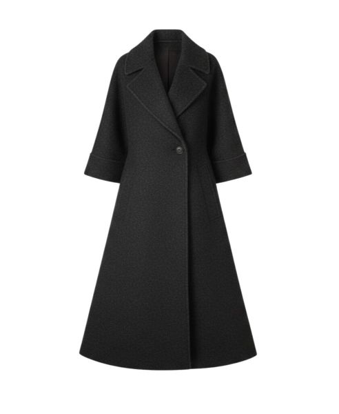 This elegant, noir-style A-line coat is cut from a luxurious, textured wool blend. It features a sophisticated, wide collar and a single-button closure that defines its dramatic silhouette. The distinctive three-quarter length sleeves with wide cuffs, coupled with the generous mid-calf length, create a timeless, sweeping form. Perfect for sophisticated layering.